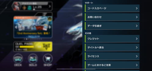 1. 現在プレイしているプレイヤーIDのホーム画面右上の設定(三本線マーク)から「データ引継ぎ」を選択。